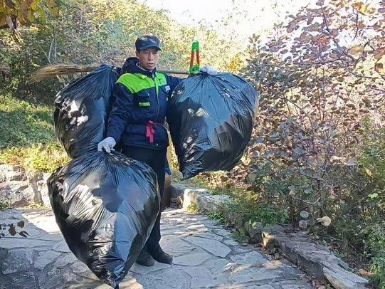 深秋的香山,黄栌、银杏、元宝枫纷纷披上彩装,与古寺、灰瓦相映成景,吸引众多市民游客前来赏秋打卡。在绚烂秋色中,有一支“园林美容师”队伍穿行于山间,将山上的垃圾背运下山。“北京晚报·香山红叶节”期间,园区日均清运垃圾量达2吨左右。